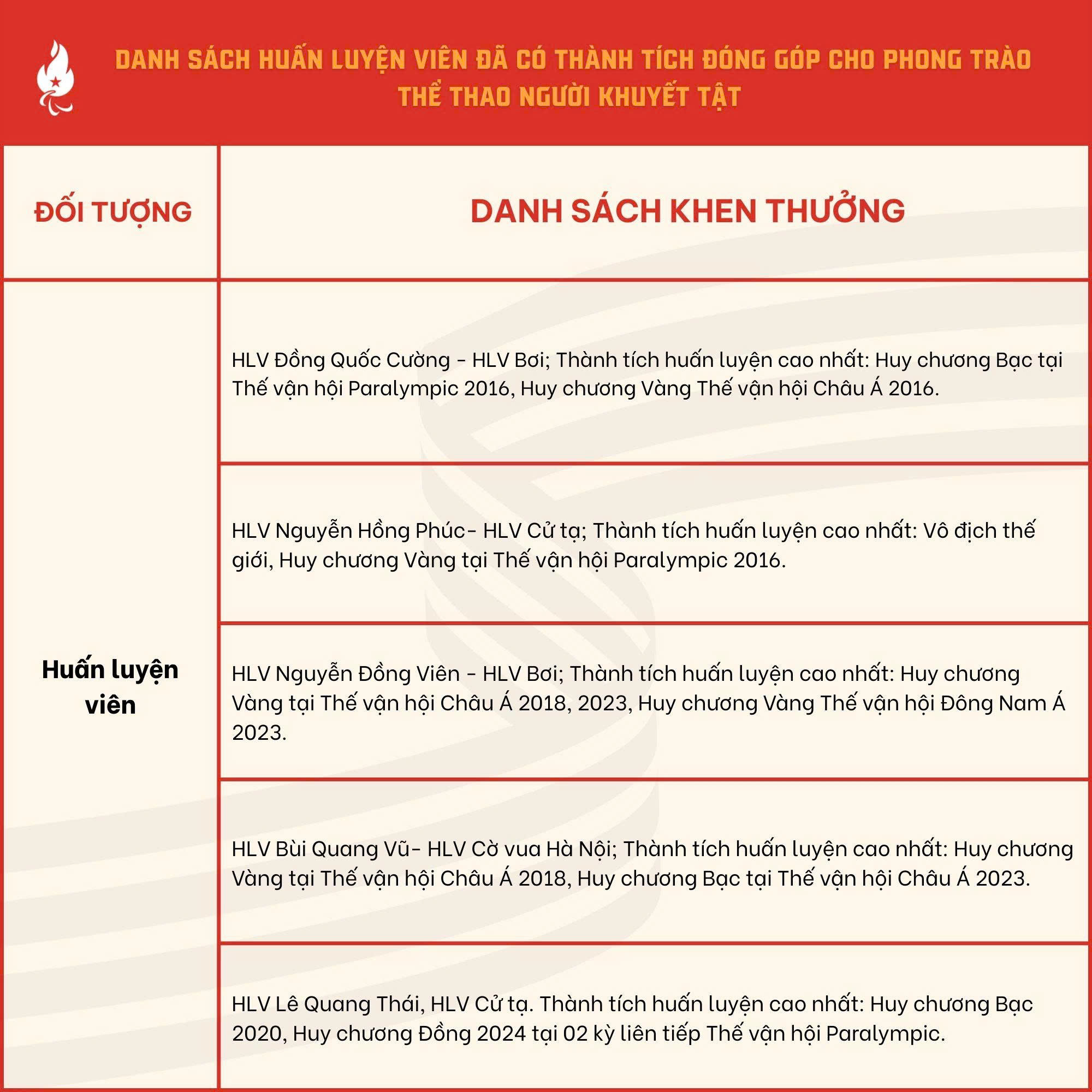 Để ghi nhận thành tích của các tập thể, cá nhân tiêu biểu có nhiều năm cống hiến, đóng góp vì sự phát triển phong trào Paralympic Việt Nam và tạo động lực phát triển phong trào thể thao người khuyết tật trong giai đoạn tiếp theo, Bộ trưởng Bộ Văn hóa, Thể thao và Du lịch đã trao tặng Bằng khen cho 2 tập thể và 8 cá nhân tiêu biểu, xuất sắc.