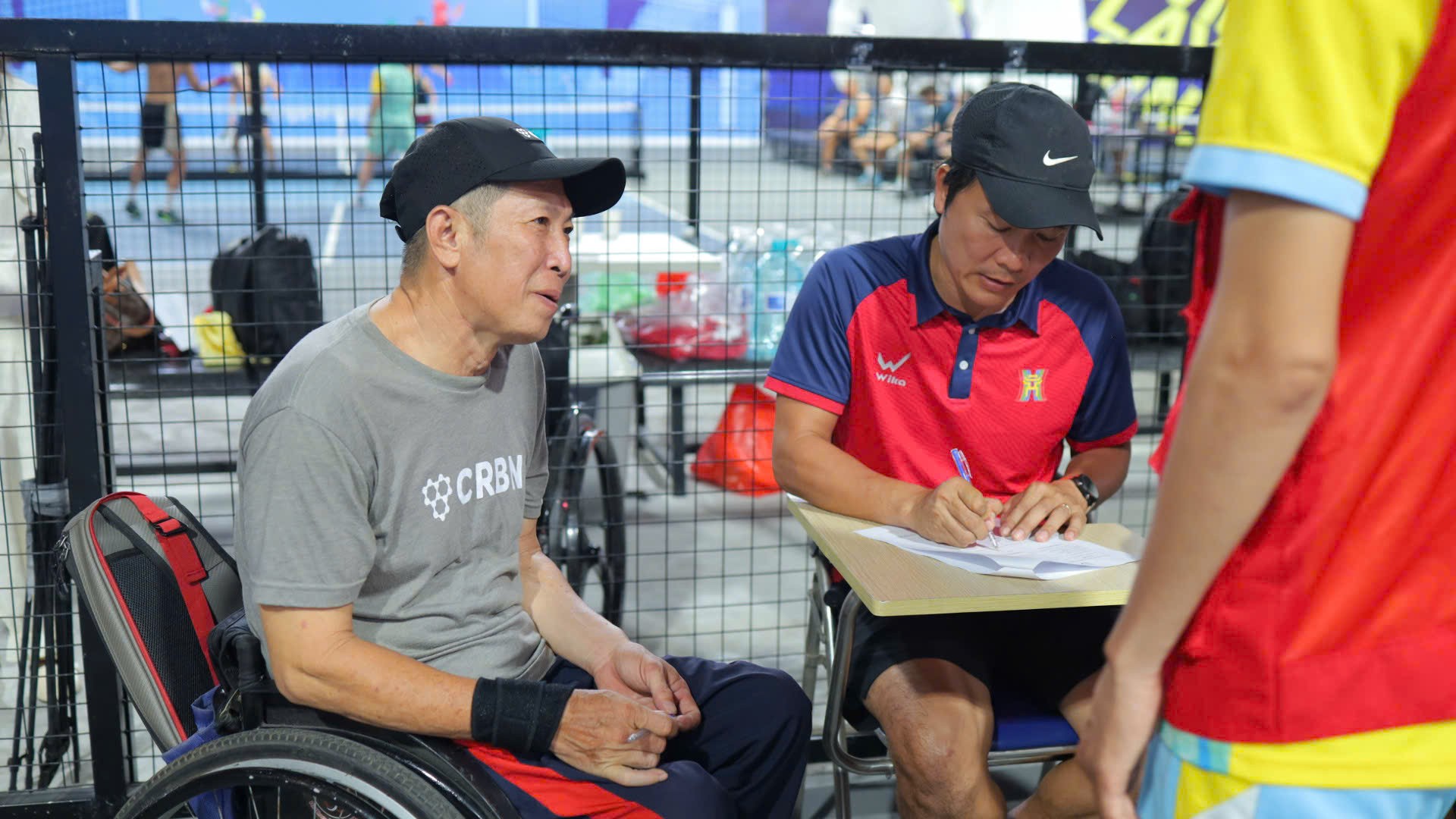 Huấn luyện viên Huỳnh Công Sơn và huấn luyện viên Thiều Đình Tuân đang phân loại thương tật cho vận động viên