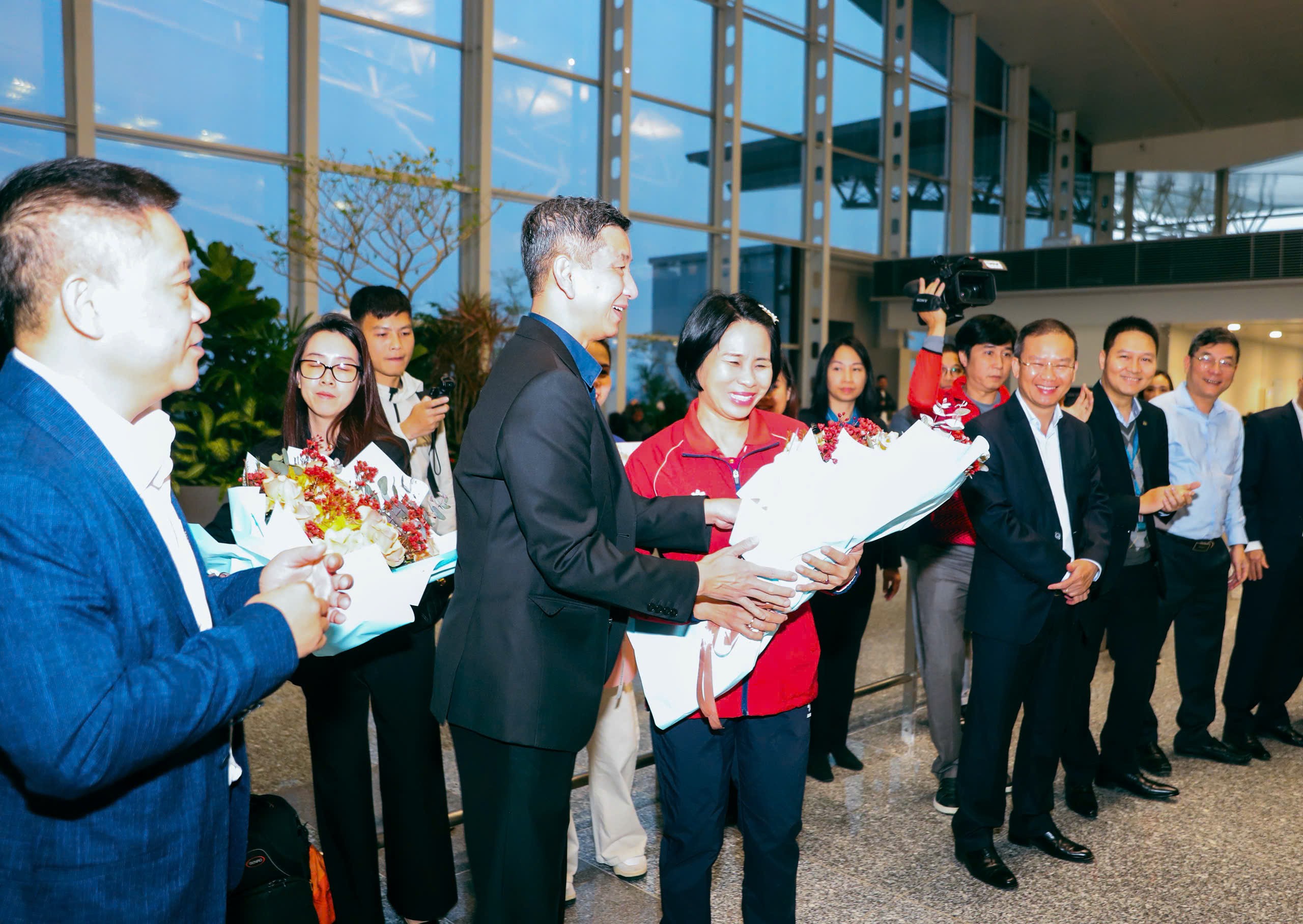 Cục trưởng Cục Thể dục thể thao Việt Nam Nguyễn Danh Hoàng Việt động viên các vận động viên tại sân bay Nội Bài. Ảnh: Quý Lượng