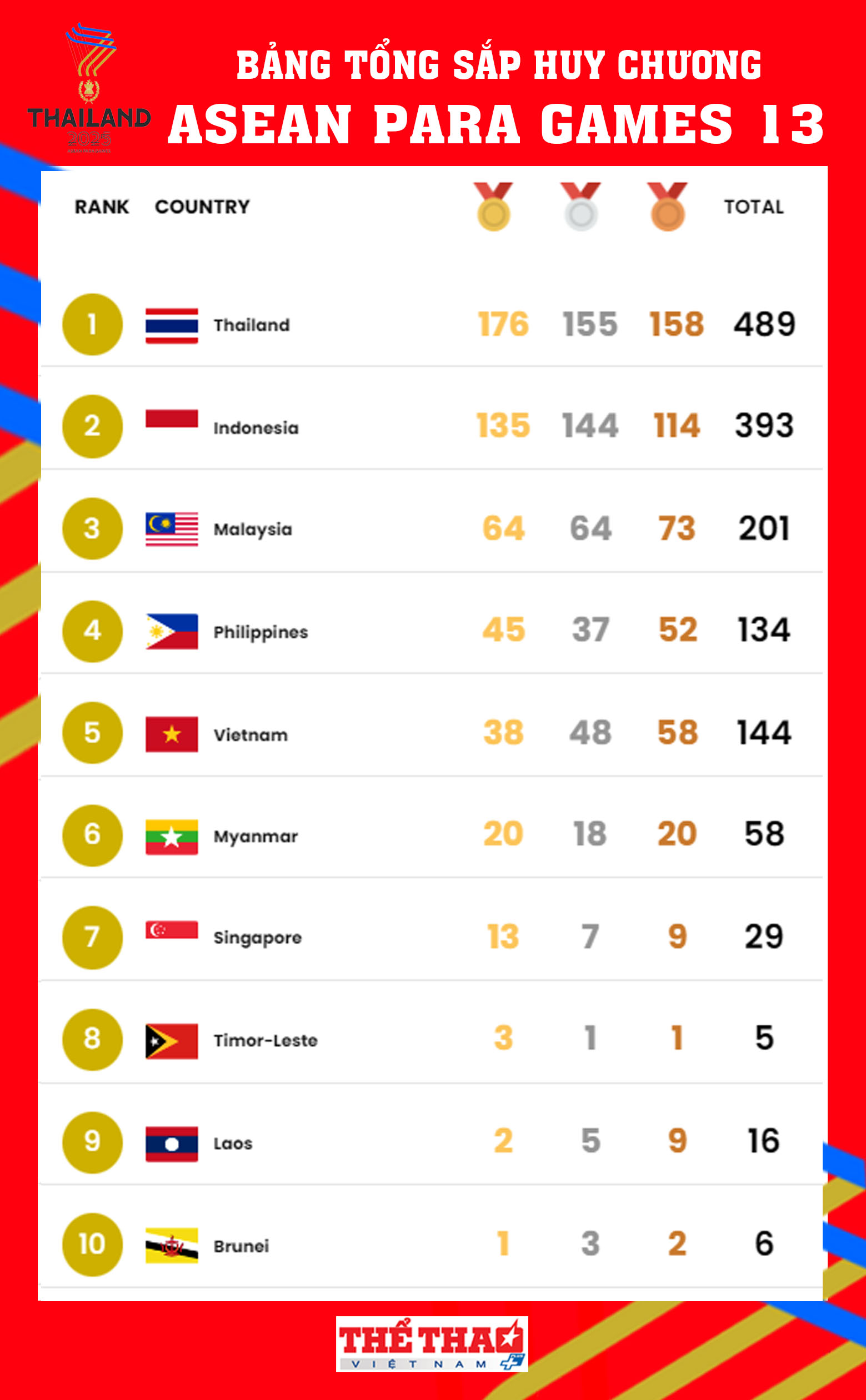 Sau 5 ngày tranh tài, các môn thi đấu của Đoàn Thể thao Người khuyết tật Việt Nam tại ASEAN Para Games 13 đã kết thúc vào chiều tối ngày 25/1. Tại Đại hội lần này, Đoàn Việt Nam giành 38 huy chương vàng, 48 huy chương bạc, 58 huy chương đồng. Thành tích này là sự ghi nhận những nỗ lực trong tập luyện và thi đấu của vận động viên - những người đã luôn vượt qua mọi khó khăn và vượt lên chính mình.