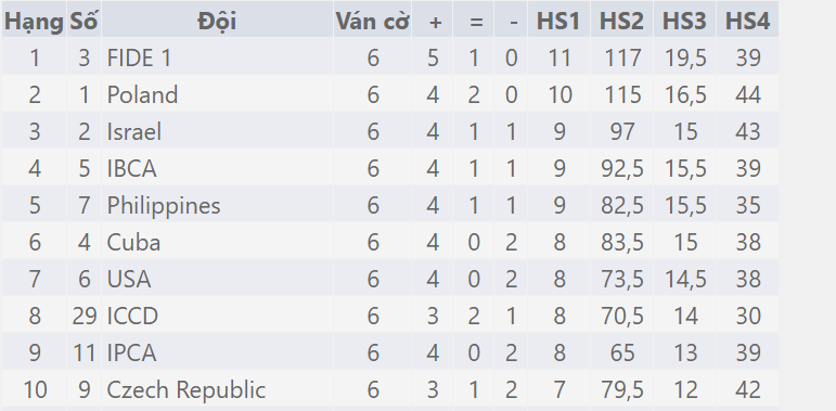 Thành tích cuối cùng của IPCA sau 6 ván đấu tại Giải Olympiad Cờ vua FIDE 2025