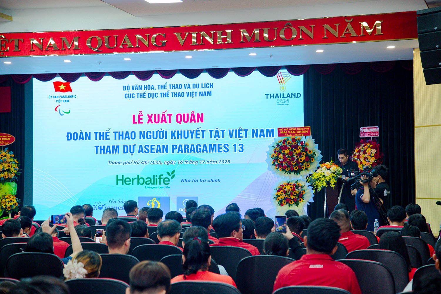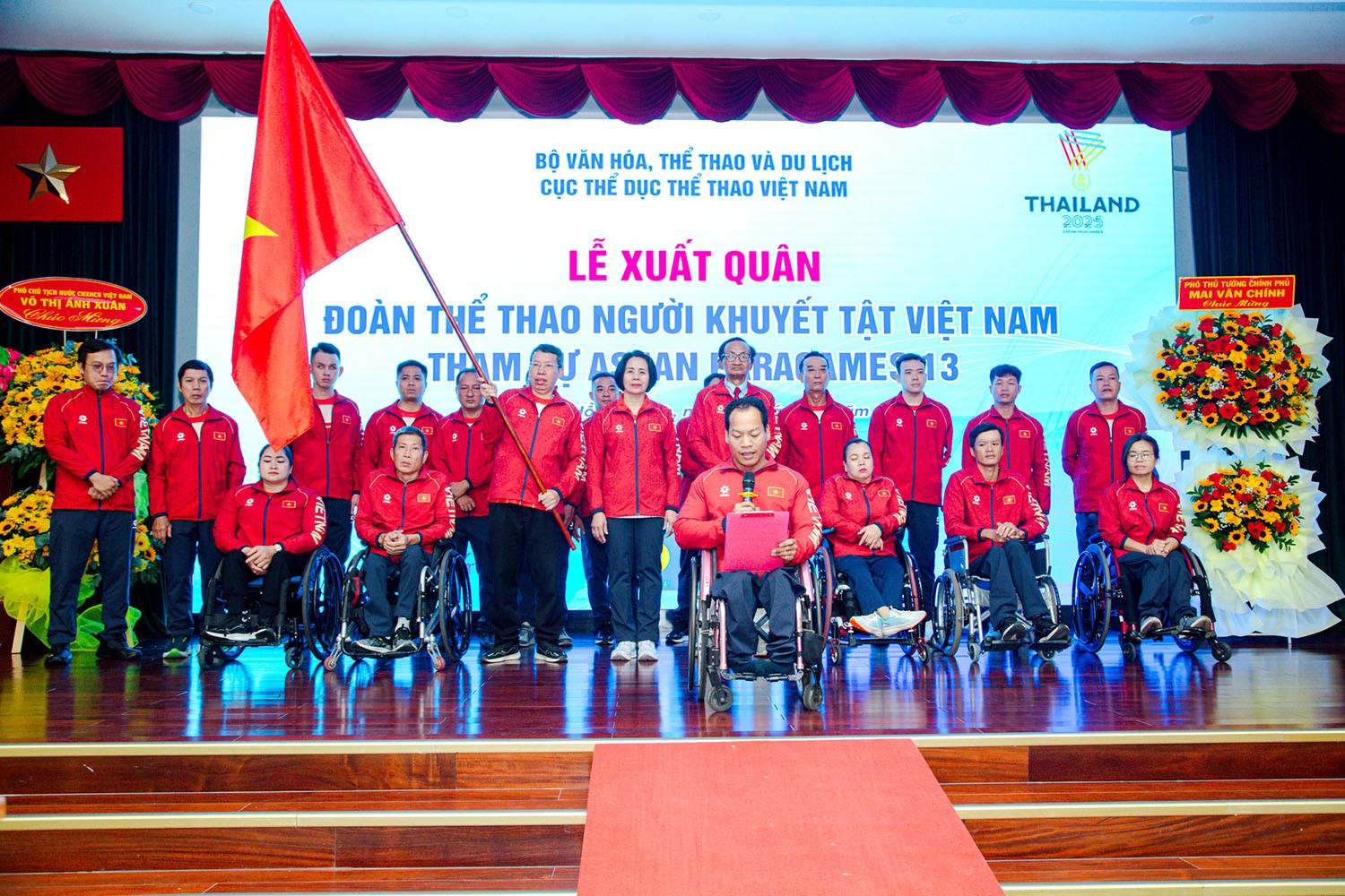 Sáng 16/12, tại Hội trường Bảo tàng Tôn Đức Thắng (TP.HCM) đã diễn ra Lễ xuất quân Đoàn Thể thao người khuyết tật Việt Nam tham dự Đại hội Thể thao người khuyết tật Đông Nam Á lần thứ 13 (ASEAN Para Games 13) tại Thái Lan. Phó Thủ tướng Chính phủ Mai Văn Chính tới dự, phát biểu và trao cờ Tổ quốc, gửi niềm tin tới các vận động viên trước giờ lên đường tham dự Đại hội.