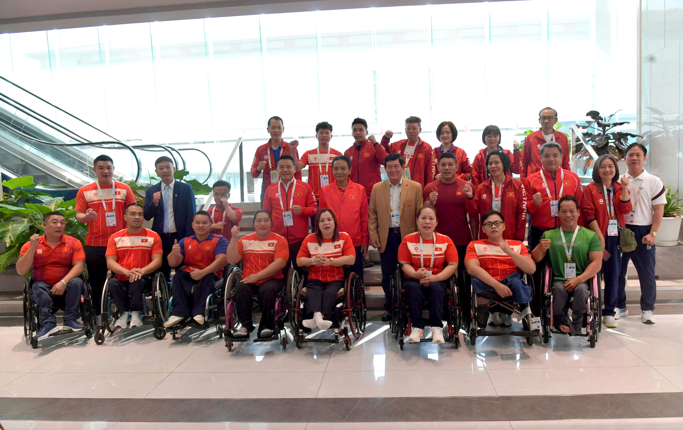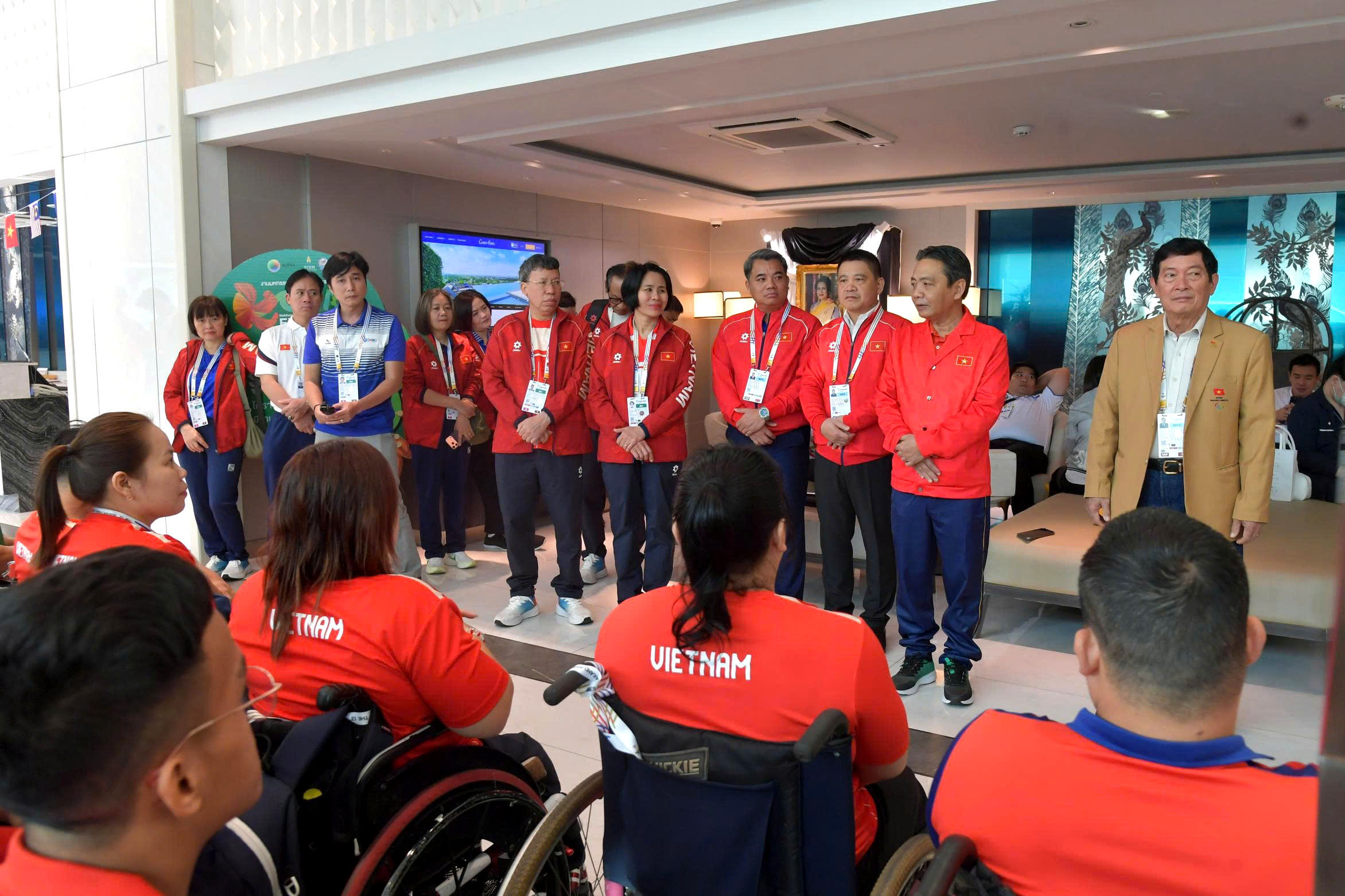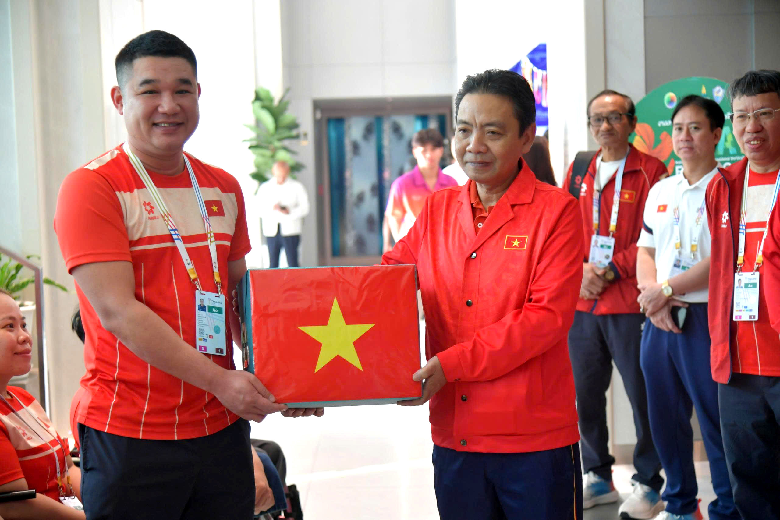 Cùng đi có: Ông Huỳnh Vĩnh Ái - Chủ tịch Ủy ban Paralympic Việt Nam; bà Lê Thị Hoàng Yến - Trưởng đoàn Thể thao người khuyết tật Việt Nam tại ASEAN Para Games 13, đại diện lãnh đạo Văn phòng Cục Thể dục thể thao Việt Nam, Trung tâm Đào tạo Vận động viên trẻ quốc gia và Đại sứ quán Việt Nam tại Thái Lan.