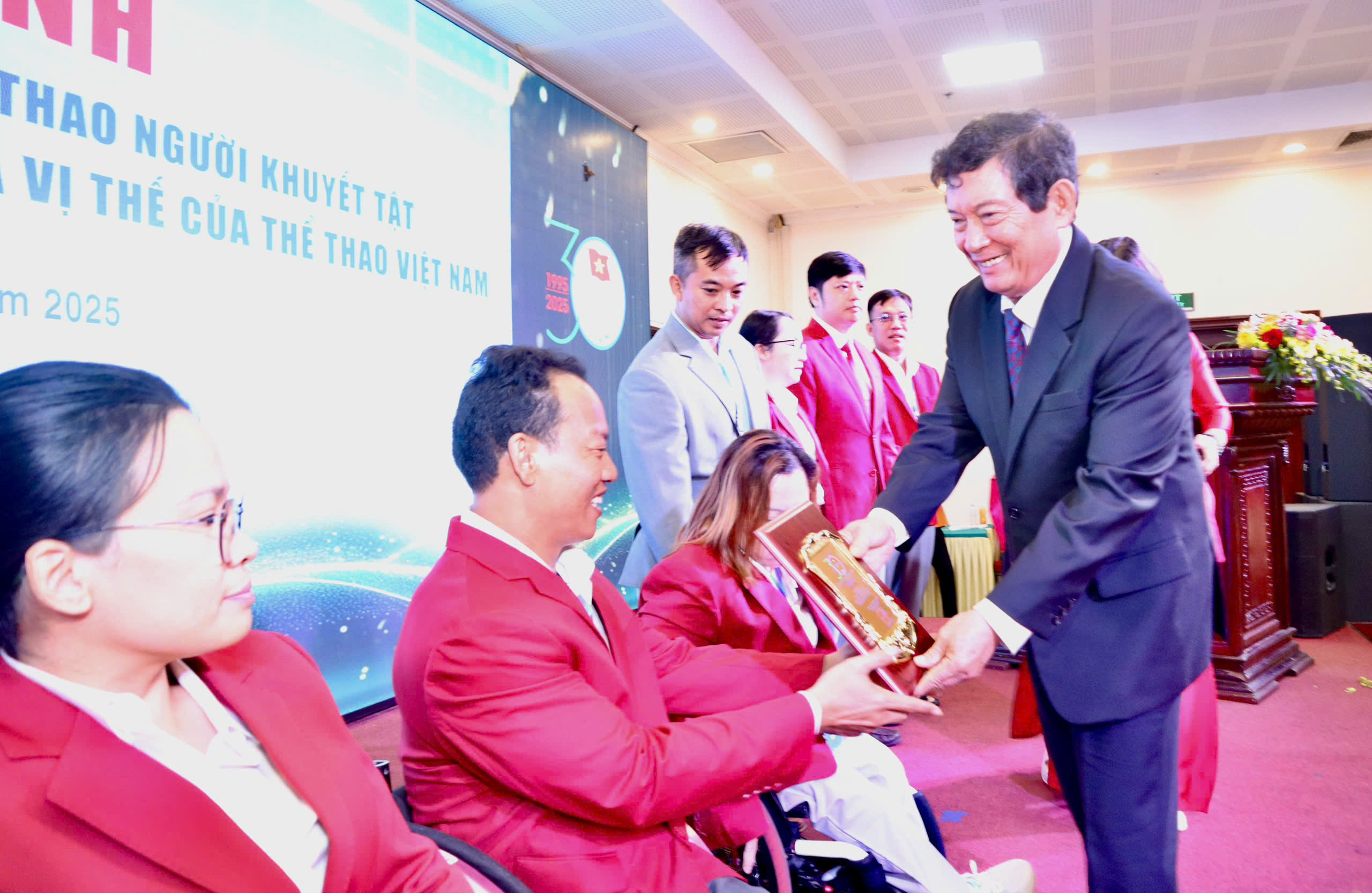 Ông Huỳnh Vĩnh Ái trao tặng bảng vinh danh cho các vận động viên, huấn luyện viên xuất sắc nhất của Thể thao Người khuyết tật Việt Nam