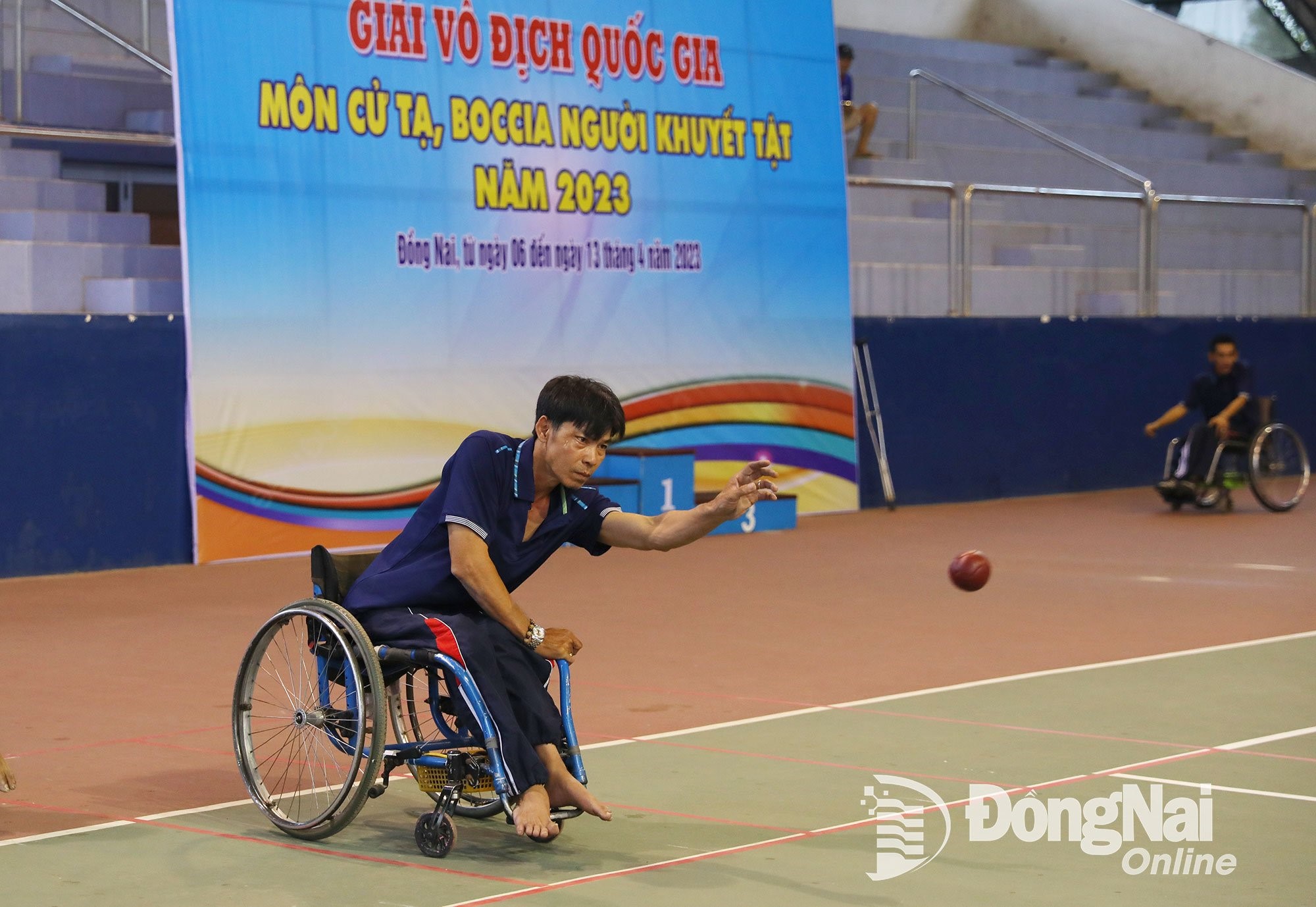 Vận động viên Nguyễn Văn Bích thi đấu môn Boccia tại Giải vô địch các môn Cầu lông, Bóng bàn, Cử tạ, Boccia người khuyết tật toàn quốc năm 2023 diễn ra ở Đồng Nai. Ảnh: Huy Anh
